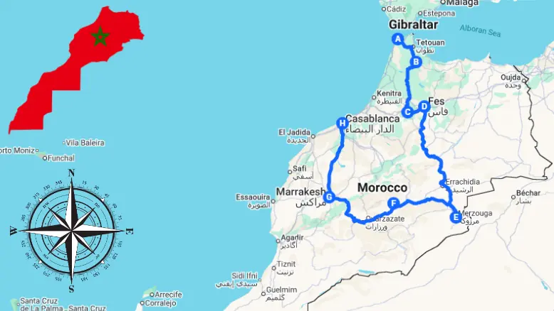 Chefchaouen, Volubilis, Meknes, Fes, Ifrane, Azrou, Midelt, Ziz Valley, Merzouga (Erg Chebbi), Rissani, Todra Gorges, Dades Valley, Rose Valley, Ouarzazate, Ait Ben Haddou, Marrakech