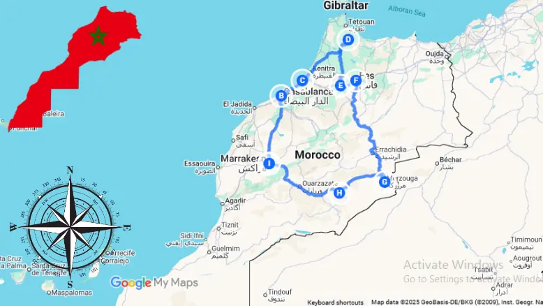 Marrakech, Rabat, Casablanca, Chefchaouen, Volubilis, Meknes, Fes, Middle Atlas, Merzouga (Erg Chebbi), Dades Valley, Ouarzazate, Ait Ben Haddou, High Atlas Mountains