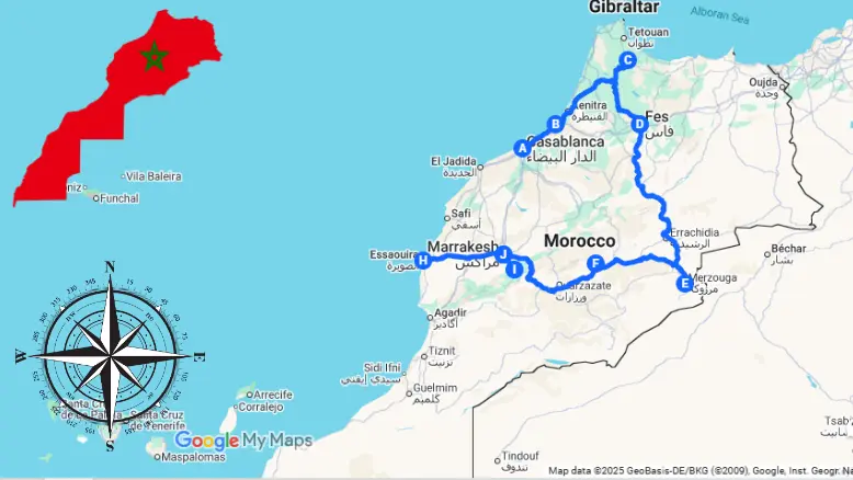 Casablanca, Rabat, Chefchaouen, Volubilis, Meknes, Fes, Ifrane, Ziz Valley, Merzouga (Erg Chebbi), Erfoud, Todra Gorge, Dades Valley, Ouarzazate, Ait Ben Haddou, Taroudant, Agadir, Essaouira, Marrakech, Ouzoud Waterfalls,