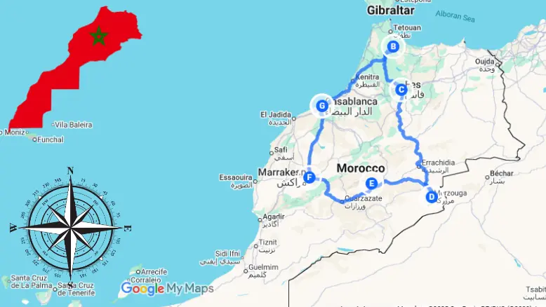 Chefchaouen, Fes, Ifrane, Middle Atlas Mountains, Ziz Valley, Merzouga Desert, Rissani, Todra Gorge, Dades Valley, Ouarzazate, Ait Ben Haddou, High Atlas Mountains, Marrakech