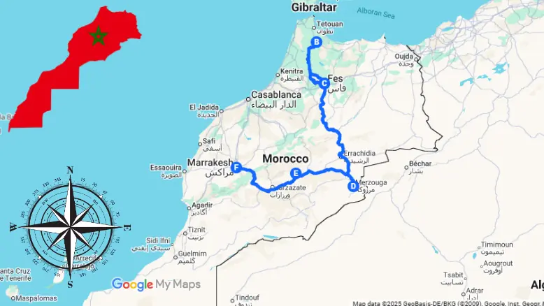 Fes, Chefchaouen, Ifrane, Azrou Cedar Forest, Midelt, Ziz Valley, Merzouga Sahara Desert, Todra Gorges, Dades Valley, Ouarzazate, Ait Ben Haddou, High Atlas Mountains, Marrakech