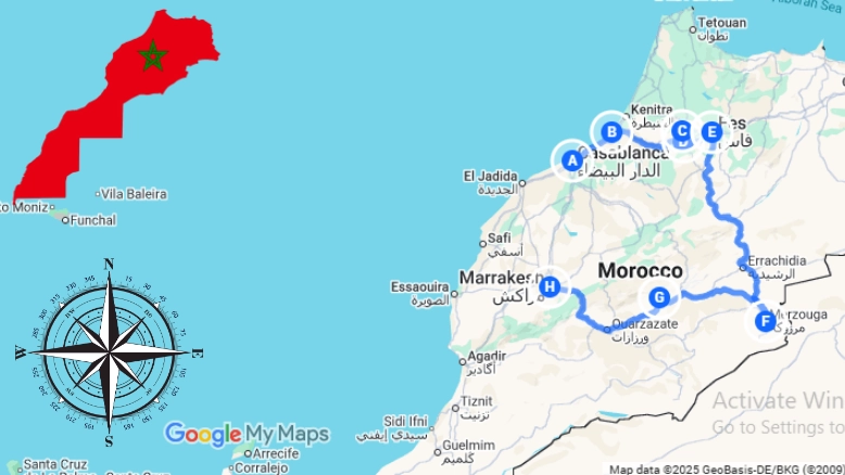Casablanca, Volubilis, Meknes, Fes, Ifrane, Cedar Forest, Midelt, Ziz Valley, Merzouga (Erg Chebbi), Rissani, Erfoud, Todra Gorge, Dades Valley, Rose Valley, Skoura Oasis, Ouarzazate, Ait Ben Haddou, High Atlas Mountains, Marrakech